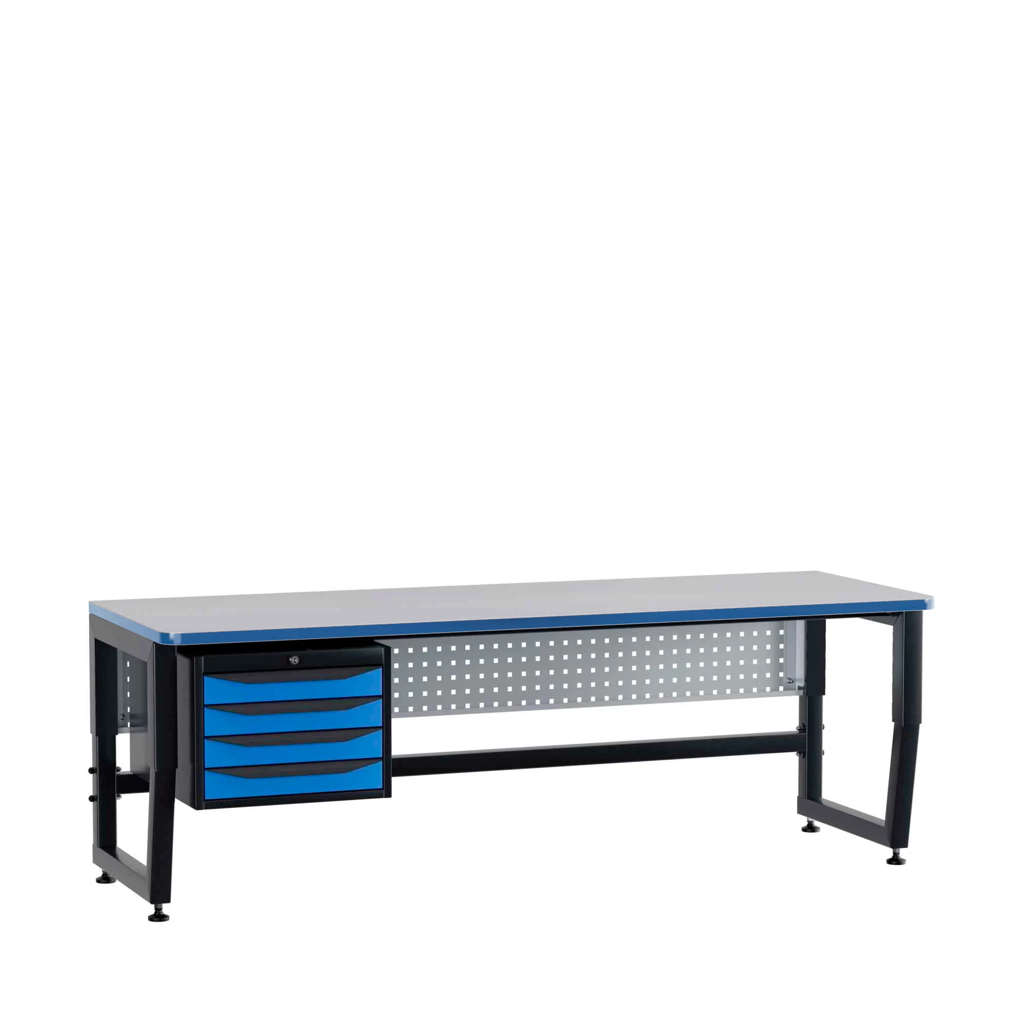 Регулируемая высота (700–850 мм) позволяет настроить рабочую поверхность под рост сотрудника, снижая утомляемость при длительной сборке или пайке. Равномерно распределённая нагрузка до 300 кг (максимальная – 500 кг) даёт возможность размещать тяжёлые оснастки, тиски и оборудование. Конструкция включает однотумбовый модуль хранения, что особенно удобно для организации инструментов и расходных материалов.