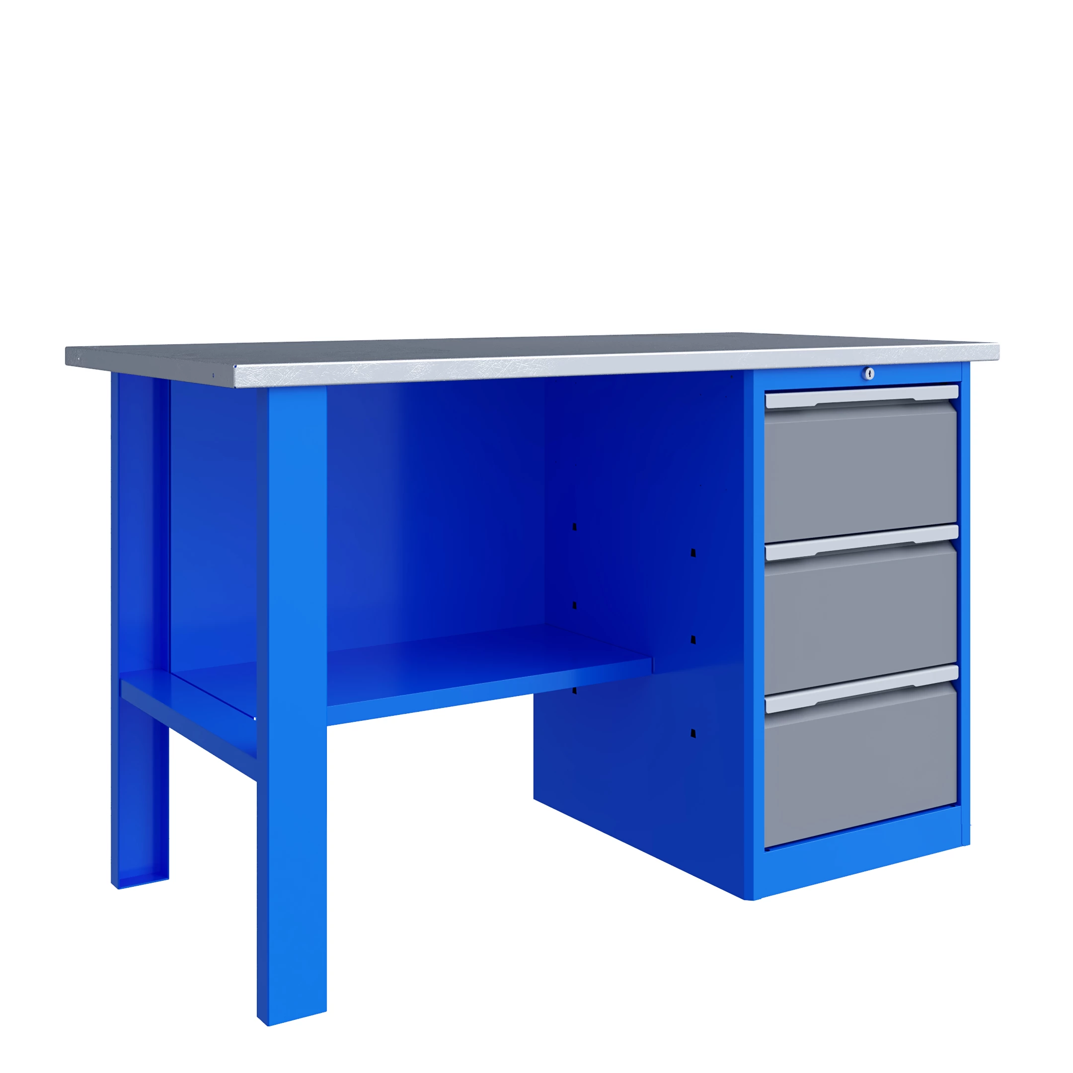 Верстак серии Technic 141.13.2 состоит из столешницы шириной 1396 мм, опоры, тумбы P3 с тремя большими ящиками и полки-стенки.