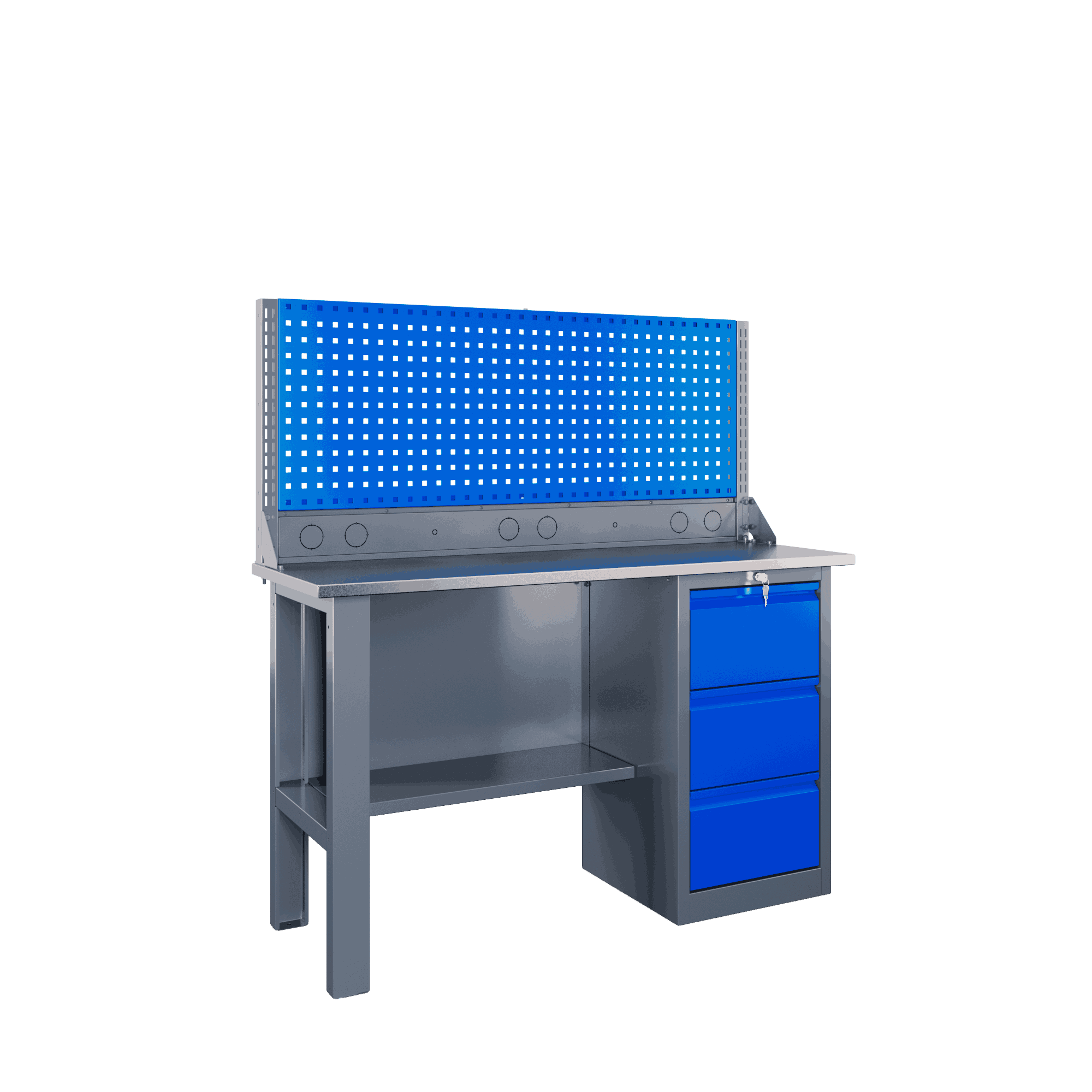 Чтобы заказать максимально функциональное пространство, инженеры предусмотрели удобную систему хранения. Вместительная однотумбовая секция скрывает усиленный ящик, максимальная нагрузка на который составляет 45 кг. Инструмент всегда будет на своем месте. Задняя полка-стенка с перфорацией 12х12 мм и шагом 38 мм открывает широкие возможности для навесного размещения держателей, крючков и мелких деталей, держа всё необходимое перед глазами. При внушительных габаритах конструкции (1473 мм в высоту, 1400 мм в ширину и 500 мм в глубину), вес изделия составляет 66,07 кг, что подтверждает использование толстого добротного металла без компромиссов в надежности.
